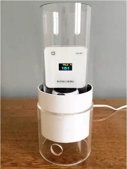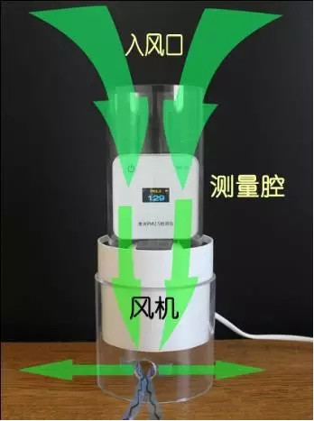 通電后,風(fēng)機(jī)轉(zhuǎn)動(dòng)時(shí)帶動(dòng)氣體向下流動(dòng),將口罩套在入風(fēng)口,在風(fēng)機(jī)的作用下,氣體透過口罩從入風(fēng)口進(jìn)入測(cè)量腔中,分別測(cè)量通電前PM2.5濃度和口罩過濾后的PM2.5濃度。