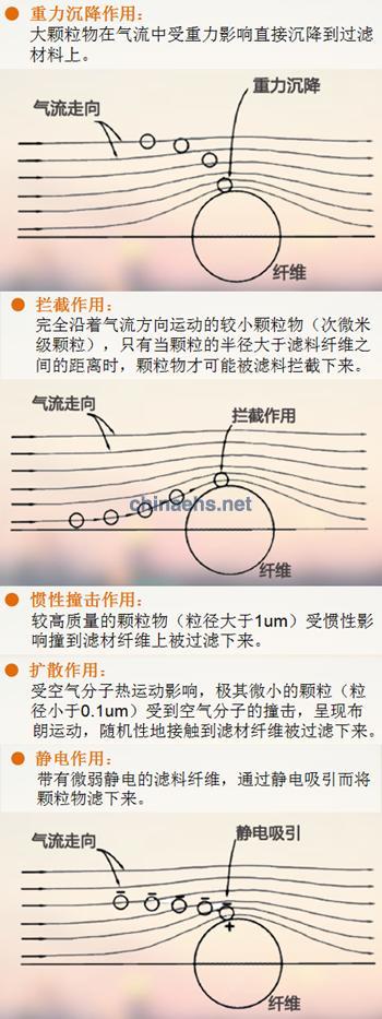 影響口罩防護(hù)水平的主要因素之一是濾材的過濾效率。用于過濾顆粒物的濾材,不管是天然的,還是人工合成的,它們將空氣中的顆粒物過濾下來的機(jī)理可概括為以下五種: